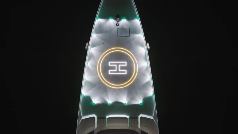 При открытых дверях главная палуба незаметно переходит из кокпита в салон, где низкий L-образный диван и вращающиеся на 180° кресла позволяют в полной мере насладиться видом на море. Ребристая стеклянная перегородка, отделяющая гостиную от рулевой рубки (откуда есть отдельный доступ к каюте экипажа, что гарантирует приватность на борту), служит изысканным фоном для круглого мраморного стола Botticino – центрального элемента обеденной зоны.