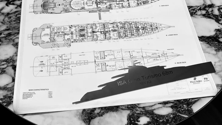 The full-beam 6.22-metre wide master cabin amidships is separated from the engine room by a generous bathroom. The VIP cabin is traditionally located forward, and there is one double and one twin cabin between them. There is also an option of a three-cabin layout and separate quarters for a crew of four (two cabins and a galley).